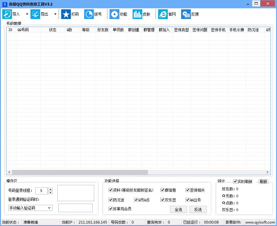 奇易QQ资料查询工具是一款帮助用户一键快速查询QQ资料的工具,这款软件操作简单,免费使用,它支持多线程查询QQ查询资料、群信息查询、密保相关查询、防沉迷查询、Q币、Q点查询、QQ欢乐豆查询、QQ业务查询等信息,需要的朋友可以来试试这款奇易QQ资料查询工具。