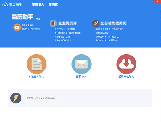 简历助手是为企业HR制作的简历管理软件,支持从EXCEL文档批量导入简历,以便将简历汇总在一起,统一存档管理,能够帮助用户快速的对求职简历进行筛选,快速的找到符合应聘要求的求职人员简历。降低招聘成本,并有新简历自动提醒功能。