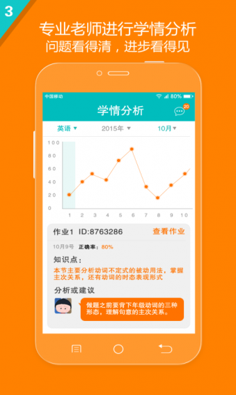 3、专属班主任学情分析:家长坚持检查的情况下,专属班主任会根据作业检查的情况每周反馈学情,让家长知道作业背后的深层次情况,问题看得清,进步看得见;