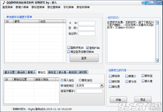 QQ群修改地址排名软件是一款帮助你的QQ群进行排名优化的软件,如果你有很多的QQ群,又不想去一个个管理,不如下载QQ群排名优化软件,可以刷新自定义地点,可修改群名称,群标签等内容,让你的QQ群有个好排名。