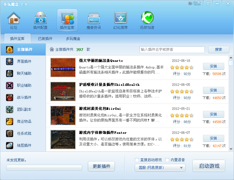 点击运行魔盒客户端,选择你需要的游戏版本(国服还是台服),确认后回到更新程序的界面,点击界面上的更新按钮。启动魔兽世界游戏后,登陆到人物选择界面,左下角插件管理按钮,可以根据需求进行选择,默认是所有的插件启用的。