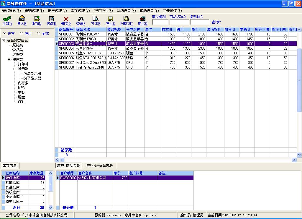 基础信息:提供多项基本的信息设置,包括:部门/人员/仓库/支付方式/账户信息/结帐方式/地区/行业/往来单位来源/往来单位分类/往来单位/商品分类/商品单位/商品等信息。部门/地区/行业/往来单位分类/商品分类等按树型结构进行分类管理,让您以后可以按大小类进行数据查询分析。在商品信息界面中可以同时录入商品对应的多个客户与供应商,让您随时可以查询出每种商品的详细客户与供应商,不同的客户/供应商可以设置不同的单价/料号。直接可以在商品信息中查看每种商品在每一个仓库的详细数量。人员/往来单位(包括供应商、客户等)/商品信息的批量数据导入功能,让您一次性完成前期数据的建立。人员分部门,往来单位(包括供应商、客户等)分行业分地区,商品分类管理,让您更加方便进行人员/往来单位(包括供应商、客户等)/商品信息管理。
