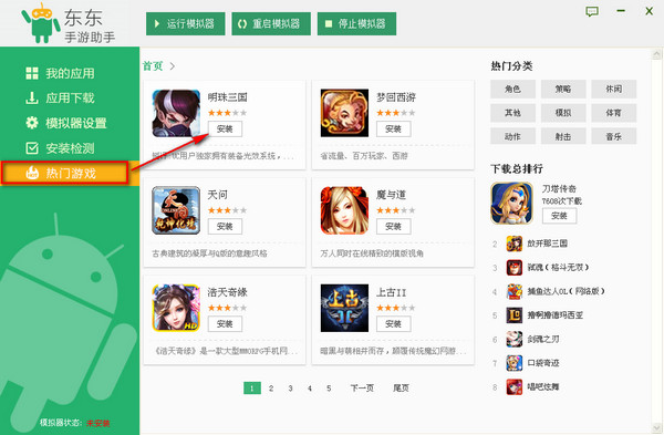 单击安装后,东东助手将在线下载安装。安装完成后可以点启动直接在模拟器中运行。