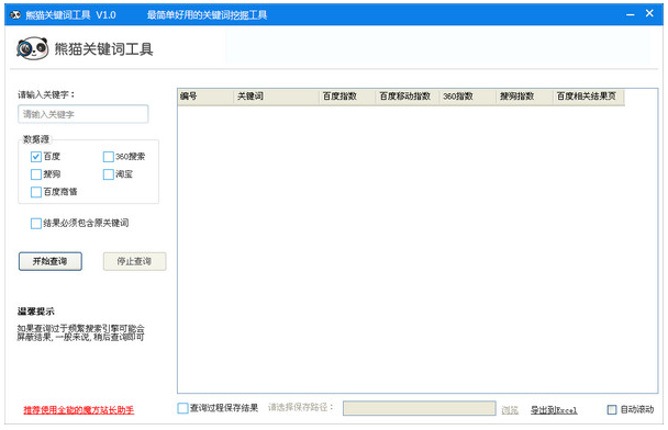 熊猫关键词工具是一款基于百度,搜狗,360搜索,淘宝的长尾关键词挖掘工具。软件小巧好用,挖掘速度快,是站长日常必备软件。
