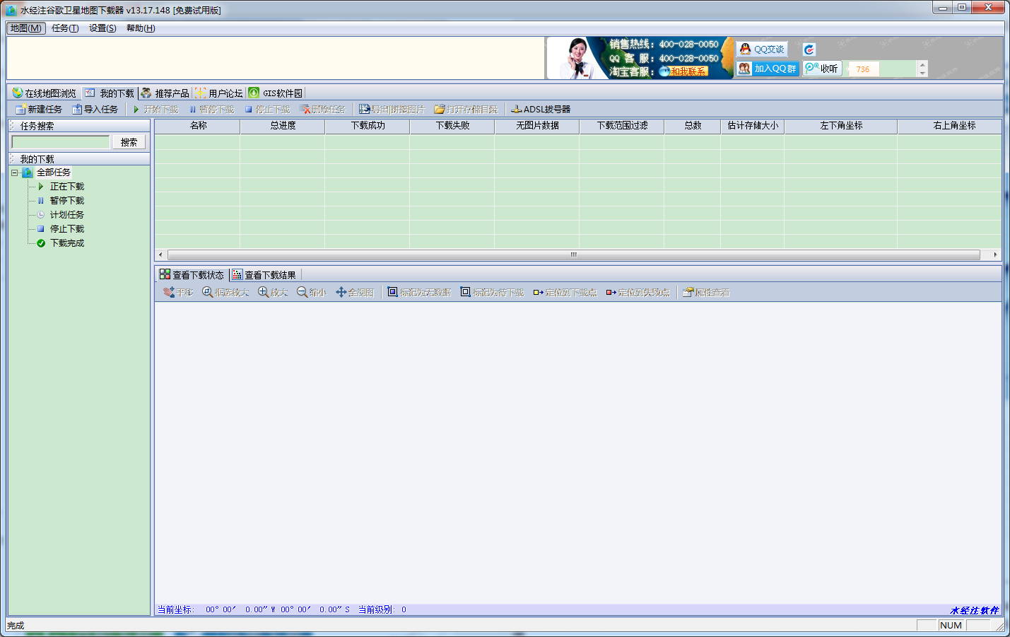软件支持可视化新建任务,在主窗口中单击“在线地图浏览”标签切换到地图浏览窗口,单击工具栏上的“框选下载区域”按钮,在视图中绘出需要下载的范围选择框,然后在该选择框内双击鼠标即可开始新建任务。