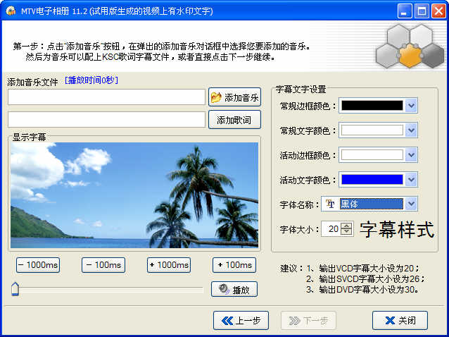 《MTV电子相册》是一款优秀的数码相册制作软件。它能将数码照片转成VCD/SVCD/DVD碟机所支持的格式,功能实用强大,又简单易用,是您家庭制作VCD/DVD电子相册的最佳选择。您可以将所拍摄的数码照片,配上喜爱的背景音乐、卡拉OK歌词字幕、背景图片、片头、片尾和转换特效,刻成光盘后,就可以像播放MTV一样在电视上播放您亲自导演的MTV了。