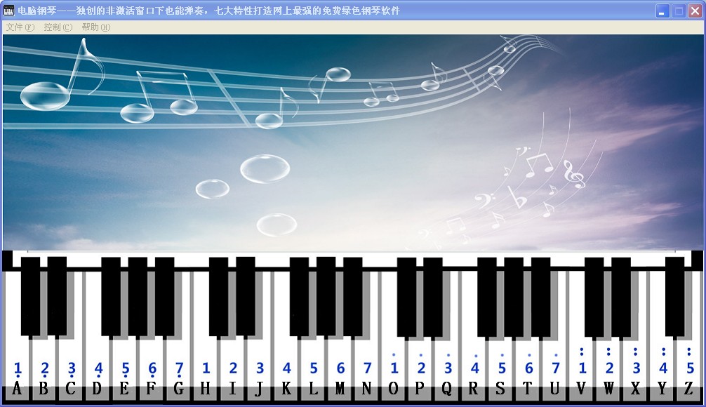 电脑键盘钢琴是一款完全免费、绿色小巧的电脑模拟钢琴软件,利用26个键盘模拟钢琴发音,独创的非活动窗口下亦可发声,方便让大人一边看贴上网,让小孩一边弹琴练习,再也不用担心小孩子弄乱你的桌面,误删你的文件了。通过这一款简单而强大的电脑虚拟钢琴软件,可以很容易的挖掘出小孩在音乐方面的天分,不用父母动辄花费上万元购买真实的钢琴。