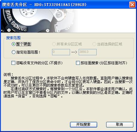 2、点击搜索分区按钮后,DiskGenius弹出搜索方式范围设定窗口。默认设置就行,点击“开始搜索”按钮搜索。