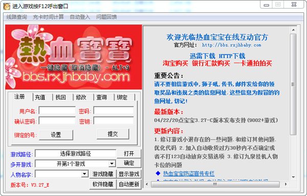 热血江湖宝宝辅助免费使用,输入任意账号和密码登入软件即可登录游戏操作,使用自己需要的功能,软件采用两种识别方式,一种是非常安全的屏幕智能识别方式、另一种就是有点风险的内存直接读取方式,由用户自由选择其中的一种。