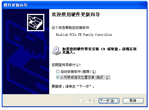 5、然后会出现您期望向导做什么。选择“从列表或指定位置安装”,单击“下一步”继续。选择一种硬件类型。在列表中选择“网络适配器”,单击“下一步”继续。