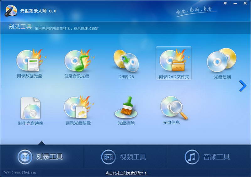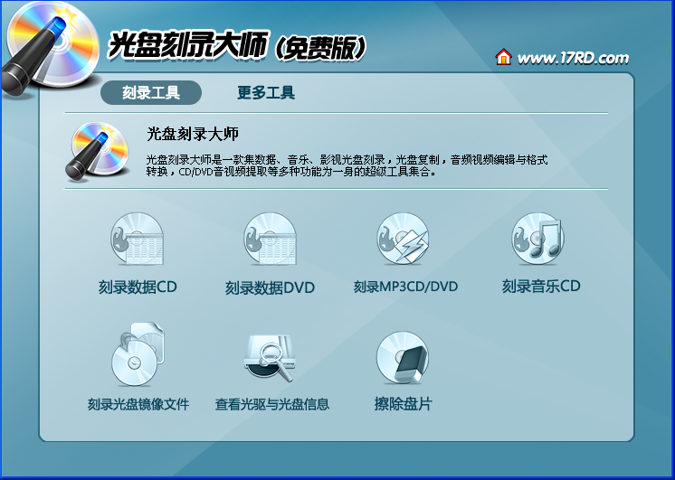 光盘刻录大师 光盘刻录大师共分为四大类,十九个功能,是一款涵盖了数据、音乐、影碟光盘刻录,光盘复制,音乐光盘制作,音视频格式转换,音视频编辑,CD/DVD音视频提取等多种功能的超级多媒体软件合集。