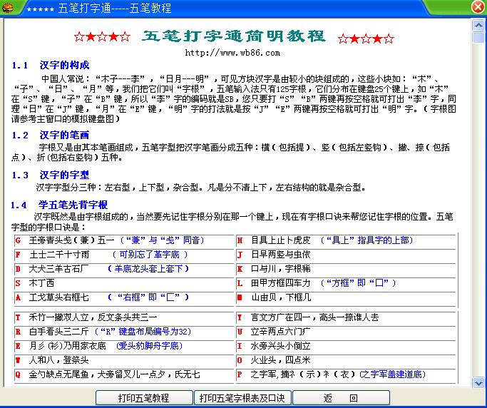 1、五笔打字通自带有五笔简明教程,短小的文章让你快速入门,你不用再买本书去学五笔了。简明五笔教程中有五笔字根表和口诀,可以打印