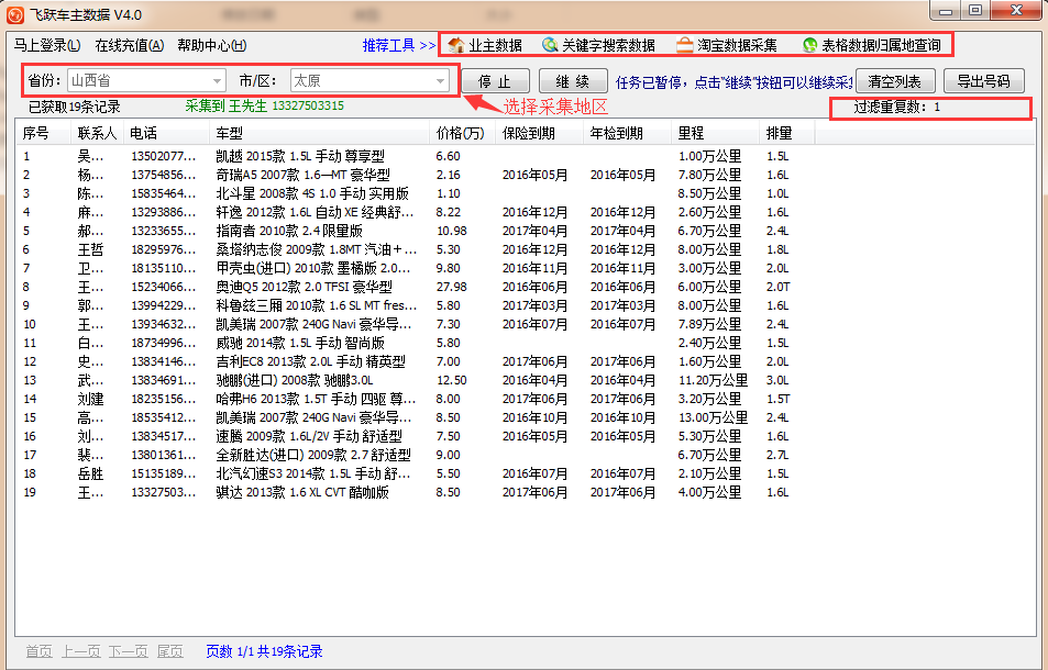 2、软件24小时自动采集,分地区进行采集,软件自动过滤重复数据。充值后采集数据量无限量获取,价格根据个人不同需求可灵活购买(一个月、三个月、一年)。