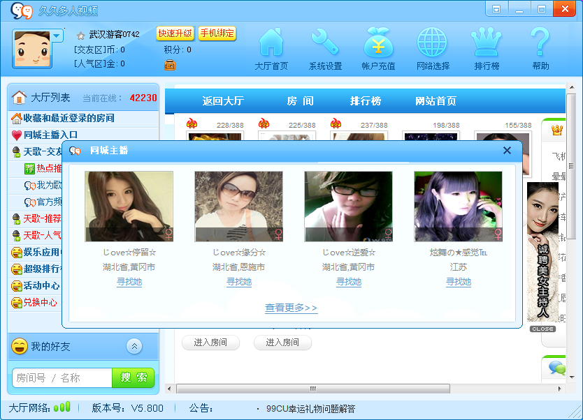 99cu多人聊天室是专门为中文用户量身定制的一款社会化多人视频直播平台 ,提供了稳定流畅的三路视频百人聊天室。目前,已经开通了基于客户端的视频聊天, 网络直播,影视播放,IM,百人聊天室,在线视频录制,在线游戏等互动设置。