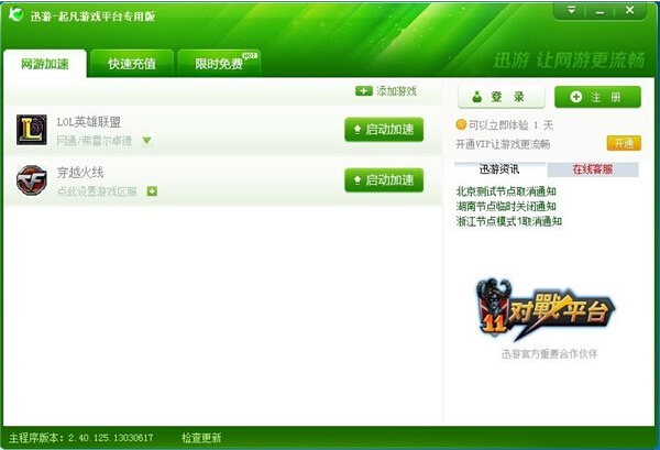 迅游加速器破解版是一款专门针对网络游戏中延时、顿卡以及无法顺利进入游戏等现象的加速软件。迅游网游加速器2013采用多项独创技术,全面覆盖国内主流网游,能有效解决您在网游中遇到的延时过高、登录困难、掉线频繁等问题,让网游从此畅爽无比!目前支持加速的有:网络游戏、对战平台、网页游戏及语音加速等,得到了上千万玩家的认可。
