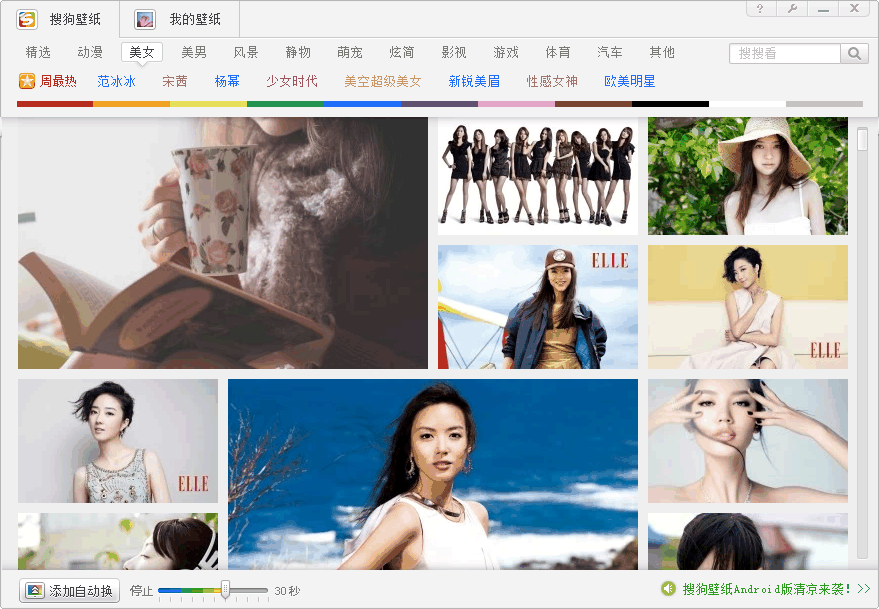 搜狗壁纸是一款高清电脑壁纸下载和自动更换软件,集成万款美女、宠物、风景、电影、节日、日历、简约壁纸,一键更换壁纸,多分辨率自适应,支持分组播放。搜狗壁纸,让你的桌面充满爱!
